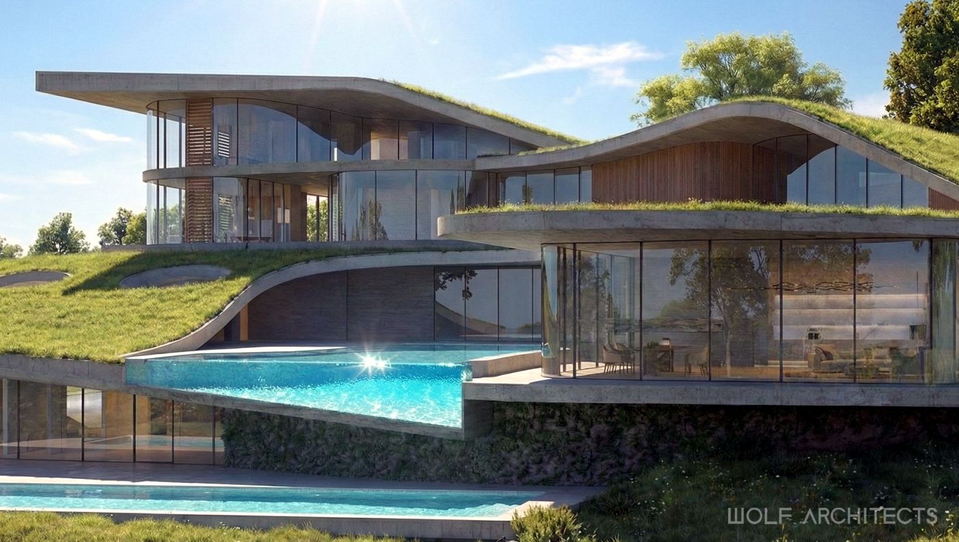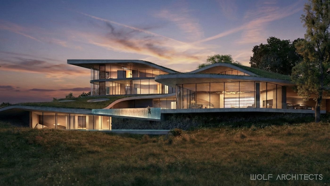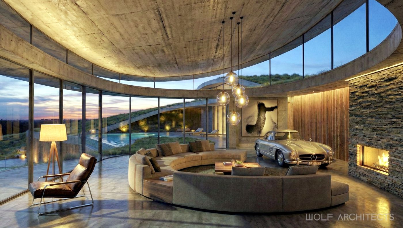 Renown for creating stunning homes throughout Australia, WOLF Architects were challenged to design the best house in the entire country. The mandate was simple- “Go for it, and create your best work…….blow us away!”. The site is a on hill in rural farmlands with excellent aspects to natural reserves and waterways. Wolf Architects approached the project with two teams of experienced designers. One to develop a layout and program to meet the clients requirements, and a second team that explored form before function. The two teams collaborated and coordinated frequently to create an organic shaped building that in the clients words were “Breathtaking and exquisite”. Further to being the best in the land this is a home that is one with the land. Garden roof spaces flow, and merge with the surrounding such that from a distance this house appears as if it were a part of the hill. Organic lines blend and merge seamlessly with one another for truly unique architectural experience.