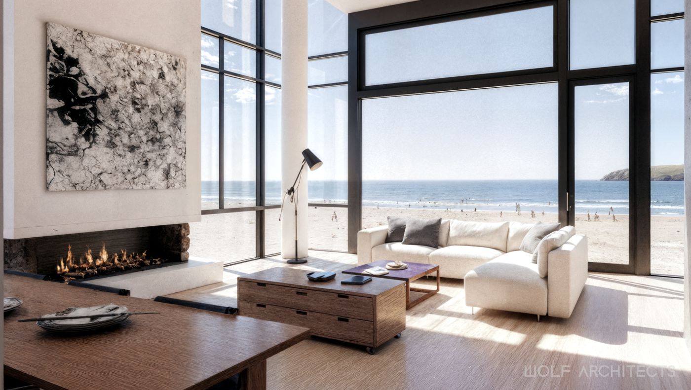 Large sliding doors and windows throughout allow direct access to the beach. The levels of the house are particularly strategic to ensure optimum views toward the horizon and the mountains in the distance. Collectively the house offers 360 degree views. Set into the roof is an open entertainment area which has become a signature feature seen commonly in many Wolf Category 3 houses. This deck not only has a 360 degree view but forms the perfect space for relaxing and viewing the stars at night. Together with roof top deck and basement, the house is essentially a 4 level home. However, the careful placement of split leveling and horizontal proportions disguise the house to be a sleek two story home. This was important as the client challenged WOLF Architects to come up with a design that made an architectural statement, while at the same time not impacting the context in a negative way. The building design and shape had to enhance the landscape rather than distract. Thus, an obvious cantilevered upper level was conceived to create a structure that appears from selected view points, hovering over the sea. A certain amount of transparency in the building’s structure was also necessary to allow as much of the sea and mountains that surround the site to be seen through the building.
