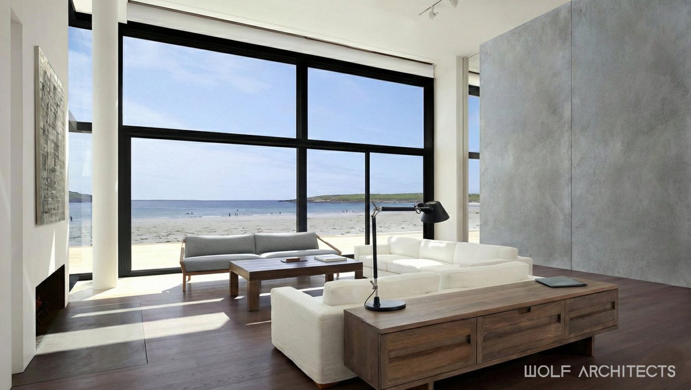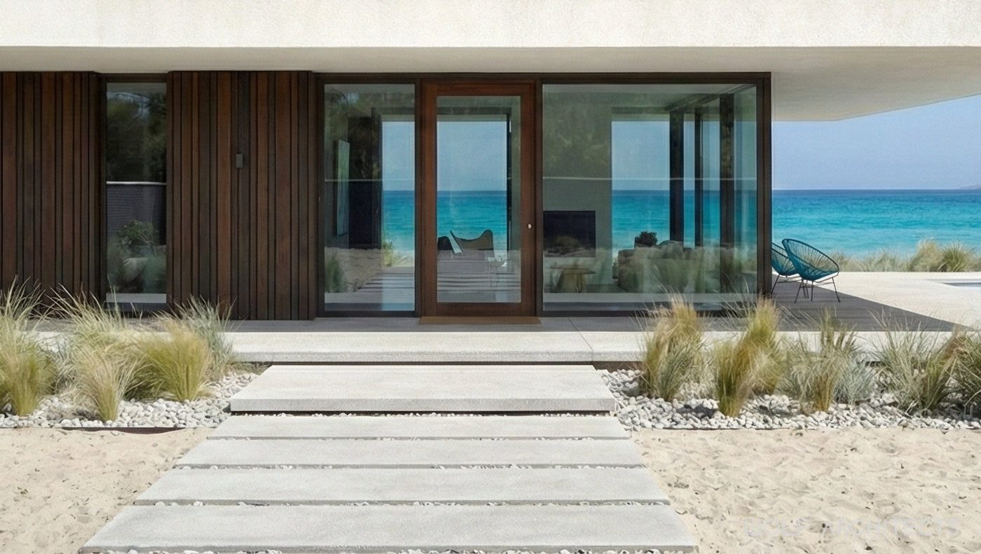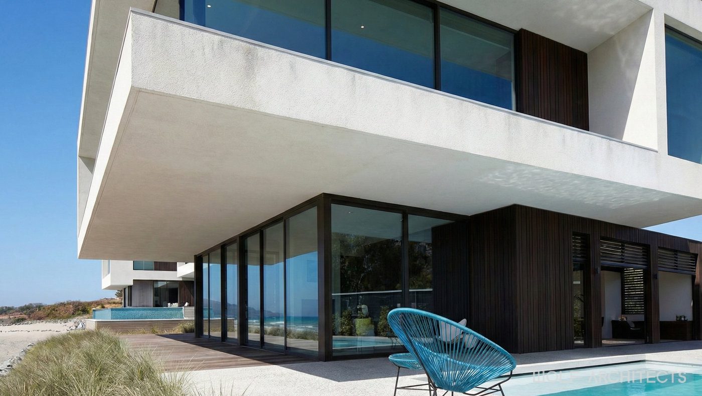 The defining external feature of the first house is a generously sized infinity pool that runs along its length and connects visually to the sea. This pool enhances the entertainment area, wrapping around three sides of the building and creating a seamless transition between the interior spaces and the beach. The basement houses a multi-car garage and wine cellar, both of which are illuminated by natural light filtering through the underside of the pool. The pool’s glass wall, a significant design and construction challenge, became one of the most expensive features. To balance the budget, the lift, pool spa and retractable outdoor roof coverings were omitted from the design.