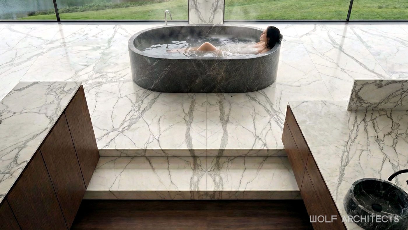 The main materials used for the exterior and structure are concrete and brick. Internally there are expanses of smooth white render to contrast against the dark brickwork. Solid American Oak is used extensively for the flooring and as well as the door and window frames. Travertine stone is used to trim various areas as skirting and almost all of the tiles used throughout the bathrooms and swimming pool were custom made. Whilst there were no limits to what the architect could select with respects to materials and finishes, it was important to ensure a sense of class and prestige. The client challenged WOLF Architects to provide the feeling and look of absolute luxury without going down the path of creating a mock French provincial style building. WOLF Architects aimed to prove that a modern contemporary building could also be luxurious, elegant and classy. In a time when people everywhere were building mock ups of classical buildings in an attempt to portray class and elegance, the Parrish house was about doing all of that and more with the contemporary flare that WOLF Architects are so well renowned for. This is not always achieved by using the most expensive of everything, it is a matter of understanding the way the eyes and hands experience space. WOLF Architects did extensive research and testing of this theory of which was implemented in the bathroom and kitchen areas to ensure that the interior design exuded elegance and opulence throughout.